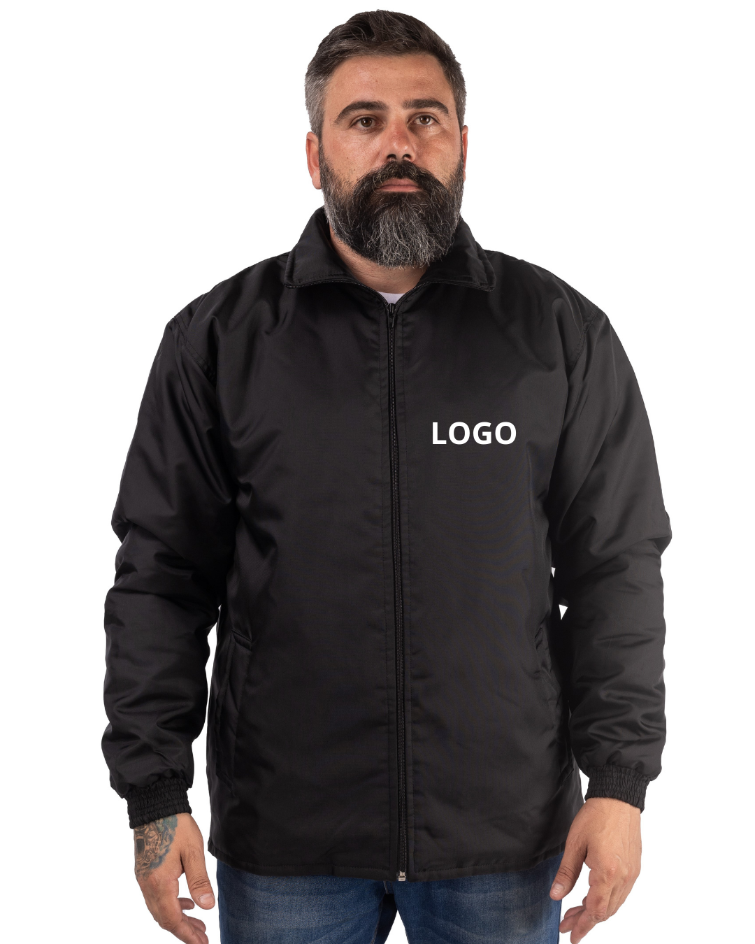 O kit contém 15 jaquetas em nylon (100% Poliamida-150g) com 1 bordado na frente.